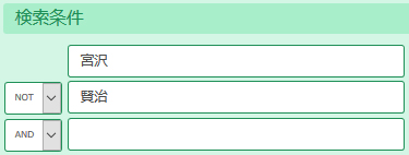 上図の例では「宮沢」という項目を含んでいるが、「賢治」でない検索結果が表示されます。